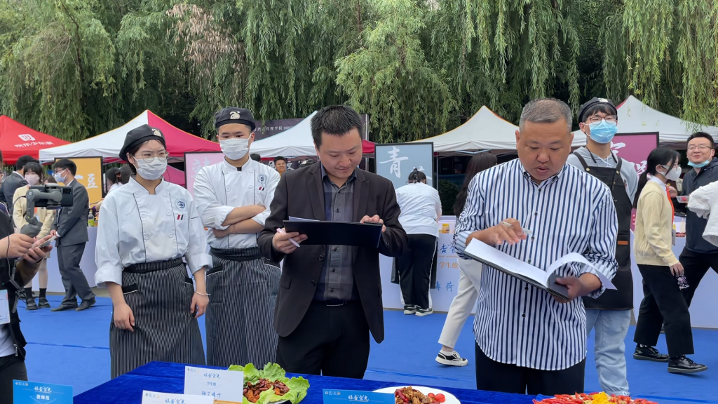 ? ? ? ?接下來(lái)是各位學(xué)子翹首以盼的決賽環(huán)節(jié),比賽場(chǎng)上,各位參賽選手紛紛拿出看家本領(lǐng),在烹飪技能方面一展風(fēng)采。這無(wú)疑是一場(chǎng)舌尖上的較量,參賽選手們用心操作,精心設(shè)計(jì),各色菜肴設(shè)計(jì)獨(dú)特,色相味型俱佳。學(xué)校優(yōu)秀專(zhuān)業(yè)教師評(píng)委與丁點(diǎn)兒股份技術(shù)中心產(chǎn)品應(yīng)用培訓(xùn)部副部長(zhǎng)陳證宇共同為選手們的菜品點(diǎn)評(píng)、打分。