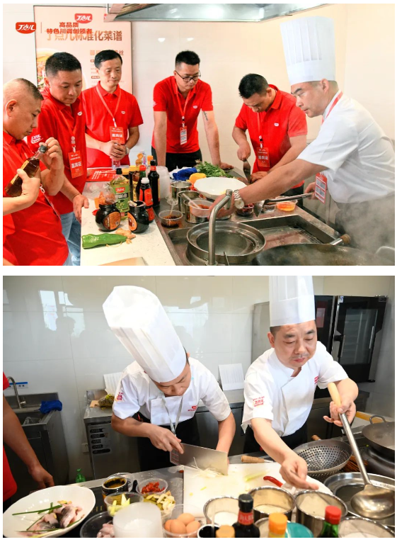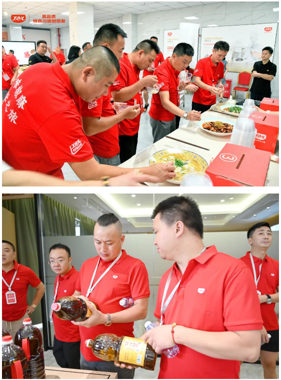 為進(jìn)一步加強(qiáng)菜品應(yīng)用,大家分組開展了盲盒食材挑戰(zhàn),現(xiàn)場進(jìn)行菜品制作。大廚們分工有序、緊密配合,用丁點(diǎn)兒干鍋醬、藤椒油、金湯酸菜醬、椒麻雞汁等產(chǎn)品快速烹制出一道道色香味俱全的精美菜品!