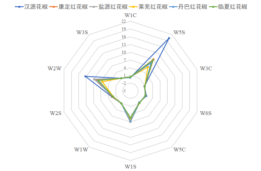 電子鼻技術(shù)設(shè)備簡(jiǎn)單,容易攜帶,操作簡(jiǎn)便,是較成熟的風(fēng)味分析技術(shù),在食品分析中應(yīng)用廣泛。劉振平博士運(yùn)用電子鼻技術(shù)對(duì)漢源花椒及與漢源花椒外觀顏色、顆粒大小類似,從表面難以區(qū)分且常用于冒充或摻假的不同產(chǎn)地的紅花椒進(jìn)行了10個(gè)傳感器通道的風(fēng)味成分測(cè)定和分析(圖1),用于漢源花椒的鑒別。