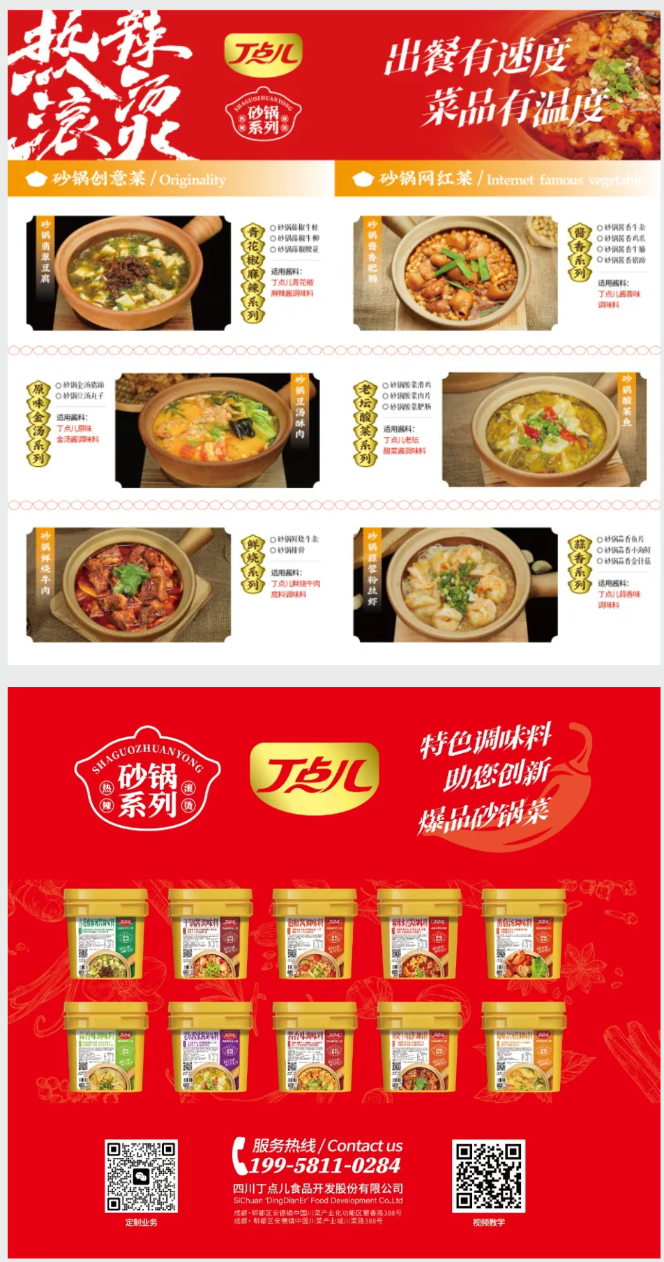 出餐有速度,菜品有溫度。熱辣滾燙的砂鍋菜作為近年來的餐飲新風(fēng)口,自帶“紅氣”。本次丁點兒食品以砂鍋菜為切入點,創(chuàng)新推出砂鍋菜系列十余款標準化特色調(diào)味料,口味覆蓋醬香、咸鮮、麻辣、香辣、酸辣、金湯等多種味型,力求滿足食客就餐新體驗的同時,又能有效實現(xiàn)門店拓品出新。