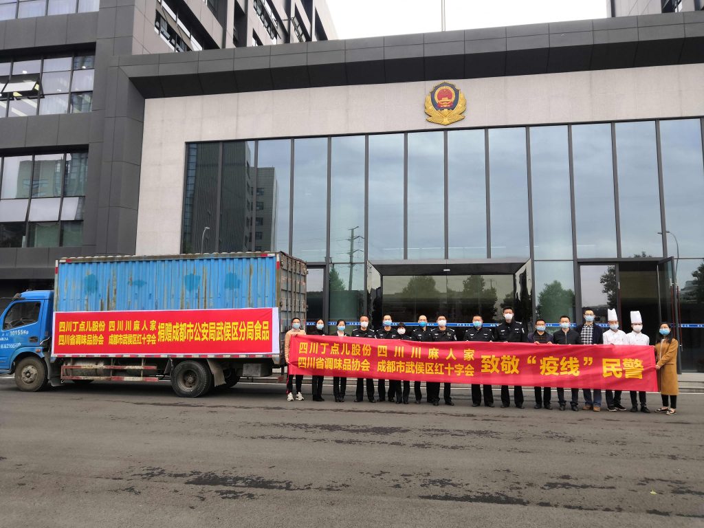 ? ? ? ? 3月27日,丁點(diǎn)兒股份積極響應(yīng)四川省調(diào)味品協(xié)會(huì)發(fā)起關(guān)于在全省調(diào)味品行業(yè)開展共赴戰(zhàn)“疫”,“味”問民警活動(dòng)的號(hào)召,再次通過成都市武侯區(qū)紅十字會(huì)向成都市公安局武侯區(qū)分局捐贈(zèng)600余件由子公司“四川川麻人家食品開發(fā)有限公司”提供的川味調(diào)料。公司副總經(jīng)理龐永強(qiáng)先生、四川省調(diào)味品協(xié)會(huì)秘書長(zhǎng)王三躍先生、武侯區(qū)公安分局、武侯區(qū)紅十字會(huì)等相關(guān)領(lǐng)導(dǎo)參與了此次捐贈(zèng)活動(dòng)。
