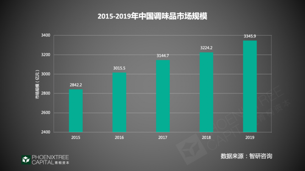 調(diào)味品自20世紀(jì)90年代后期開始市場化,2016、2017年資本熱度攀升,今年其與線上食品品牌、小家電一同躋身大消費(fèi)領(lǐng)域3大熱門賽道。據(jù)智研咨詢數(shù)據(jù),2019年中國調(diào)味品市場規(guī)模已達(dá)3345億元,8年間復(fù)合增長率為7.5%,前瞻產(chǎn)業(yè)研究院預(yù)測2020年有望突破4000億。
