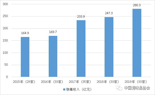 ? ? ? 2015-2019年百強(qiáng)企業(yè)醬油產(chǎn)業(yè)銷售收入分別為:164.9億元、169.7億元、233.9億元、247.3億元、280.3億元。