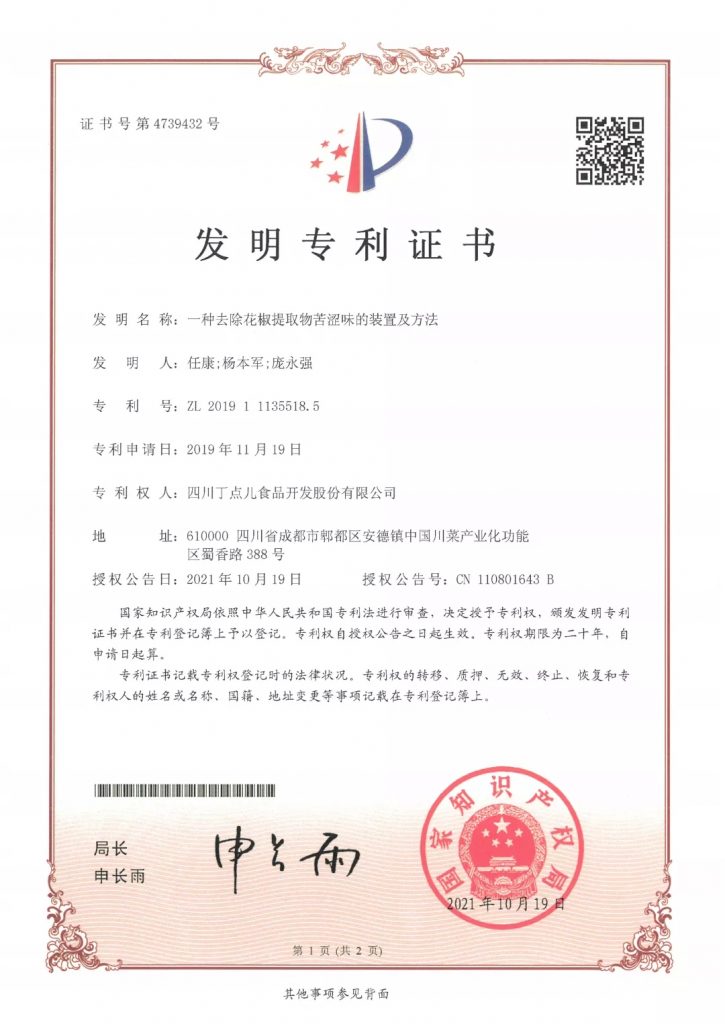 ? ? ? ?近日,丁點(diǎn)兒股份創(chuàng)新研發(fā)出《一種去除花椒提取物苦澀味的裝置及方法》并獲得國家發(fā)明專利授權(quán),這是公司在花椒及花椒制品研究方面取得的第4項(xiàng)國家發(fā)明專利。
