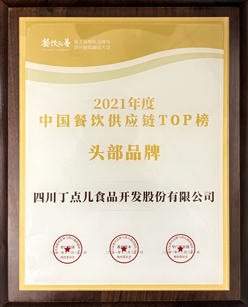 ? ? ? ? 在此次評選活動(dòng)中,丁點(diǎn)兒股份獲得各界評委的一致認(rèn)可,從參評的3000+個(gè)同類供應(yīng)商品牌中脫穎而出,獲得“2021年度中國餐飲供應(yīng)鏈TOP榜頭部品牌”稱號。此項(xiàng)榮譽(yù)是對丁點(diǎn)兒股份在中國餐飲行業(yè)做出卓越貢獻(xiàn)的高度肯定,也是對企業(yè)發(fā)展前景有著更高的期望。