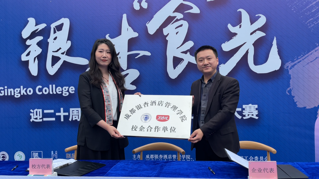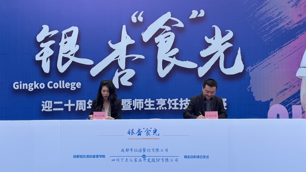 ? ? ? ?隨后,成都銀杏酒店管理學(xué)院酒店管理系執(zhí)行系主任徐君宜、丁點(diǎn)兒股份技術(shù)中心產(chǎn)品應(yīng)用培訓(xùn)部副部長(zhǎng)陳證宇代表雙方簽署戰(zhàn)略合作協(xié)議。徐主任代表學(xué)校向丁點(diǎn)兒股份授予了“校企合作”牌匾。至此,雙方正式達(dá)成校企合作共識(shí)。希冀通過(guò)雙方的共同努力,將丁點(diǎn)兒股份的品牌文化及產(chǎn)品風(fēng)味根植在餐飲烹飪學(xué)子的心中,同時(shí)促進(jìn)成都銀杏酒店管理學(xué)院烹飪學(xué)院優(yōu)秀畢業(yè)生將富含丁點(diǎn)兒風(fēng)味的美食作品更多的呈現(xiàn)在消費(fèi)者的餐桌之上。