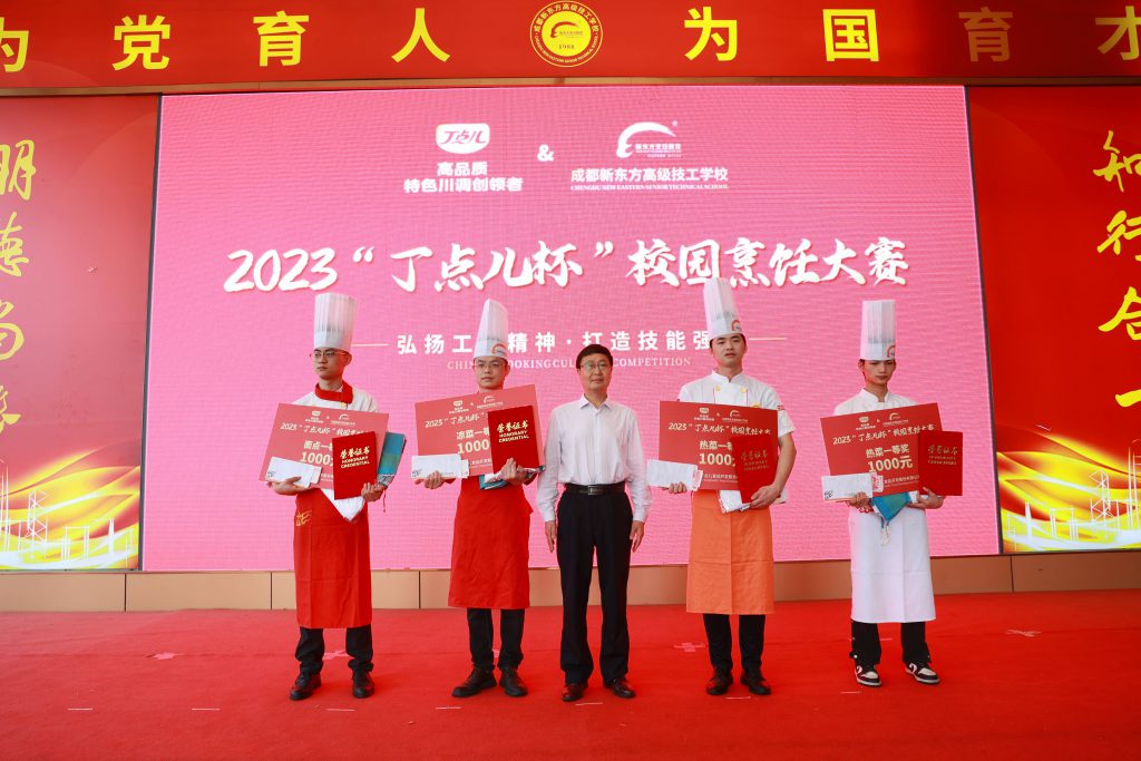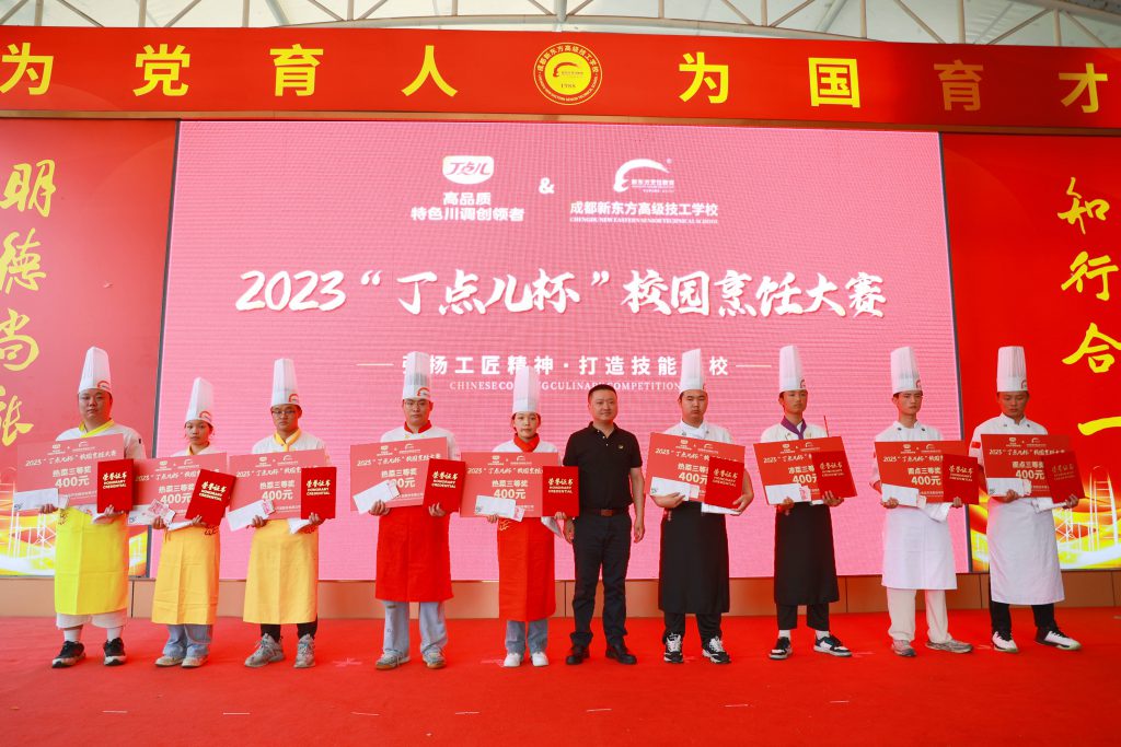 在全體師生的見證下,成都新東方高級(jí)技工學(xué)??偨虅?wù)主任周后超和丁點(diǎn)兒股份川菜大師陳證宇代表校企雙方進(jìn)行了“丁點(diǎn)兒”總廚班贈(zèng)牌儀式。“丁點(diǎn)兒”總廚班的開設(shè)是丁點(diǎn)兒股份深化校企合作的又一形式,有利于學(xué)員對(duì)特色川調(diào)生產(chǎn)工藝和產(chǎn)品知識(shí)的了解,讓學(xué)員更好掌握菜品調(diào)味技巧。