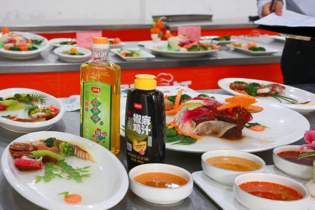 比賽中,選手們各顯神通,紛紛拿出自己的看家本領(lǐng)爭(zhēng)取拔得頭籌。丁點(diǎn)兒麻得到紅花椒油、藤椒油、干鍋醬、椒麻雞汁、金湯酸菜醬等高品質(zhì)特色川調(diào)助力選手烹飪出一道道色香味俱全的菜品,讓人贊不絕口。