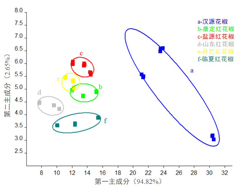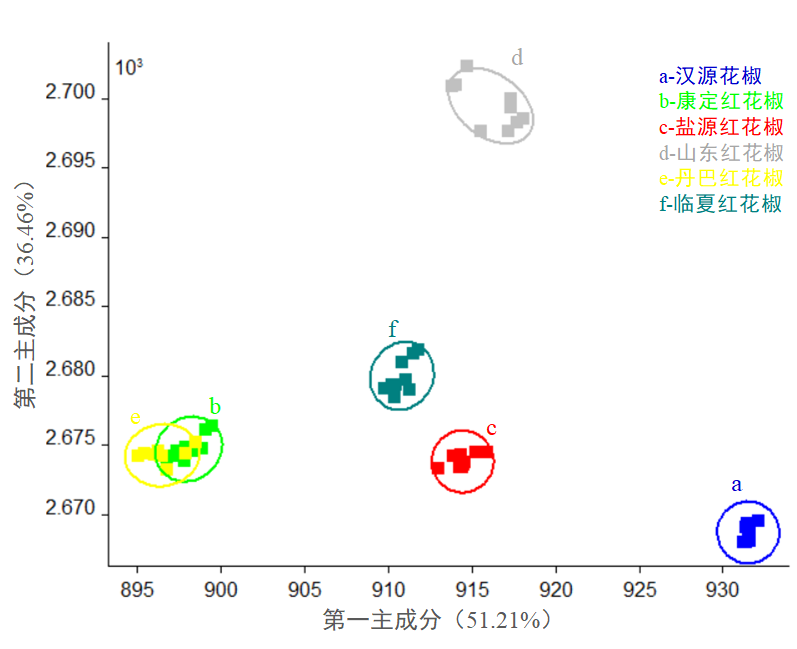 圖2:電子鼻傳感器對不同產(chǎn)地紅花椒響應(yīng)數(shù)據(jù)的PCA 得分圖