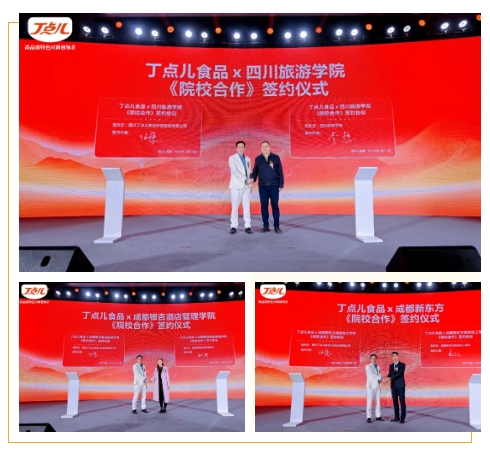 同時丁點兒食品與四川旅游學(xué)院、成都銀杏酒店管理學(xué)院、成都新東方高級技工學(xué)校進行了《院校合作》簽約,通過不斷深化校企合作,助推川菜產(chǎn)業(yè)行穩(wěn)致遠。四川旅游學(xué)院烹飪學(xué)院院長李想表示,通過科研項目、烹飪比賽等形式共同為川菜技能人才培養(yǎng)和高質(zhì)量發(fā)展作出貢獻。