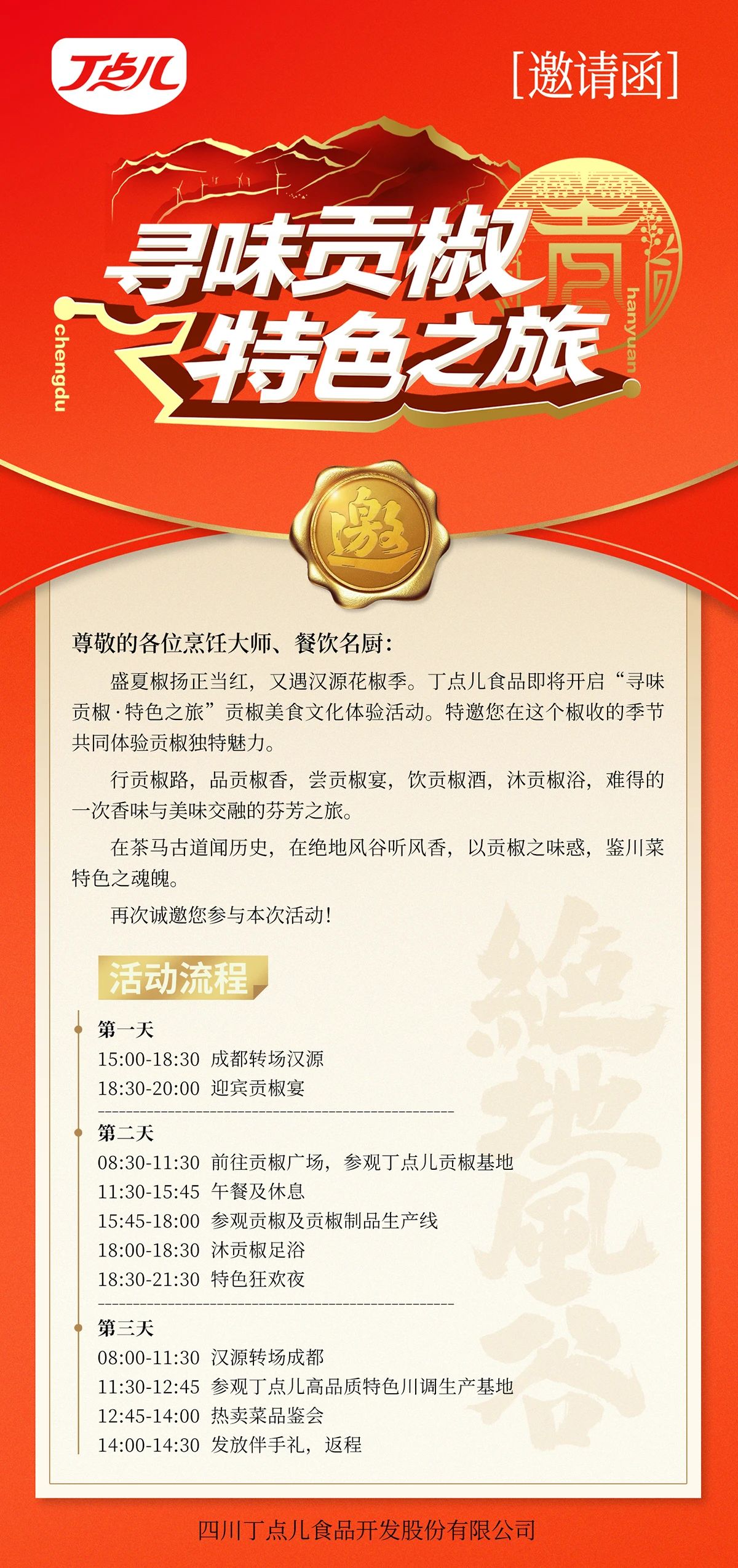8月至9月中旬,丁點(diǎn)兒食品誠邀全國各地餐飲烹飪大師、名廚和餐飲老板參與2024“尋味貢椒·特色之旅”營銷體驗(yàn)活動(dòng),我們?cè)凇按ú酥恰臂?,“貢椒之鄉(xiāng)”漢源等著您!我們將持續(xù)報(bào)道,敬請(qǐng)關(guān)注。
