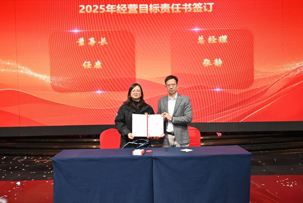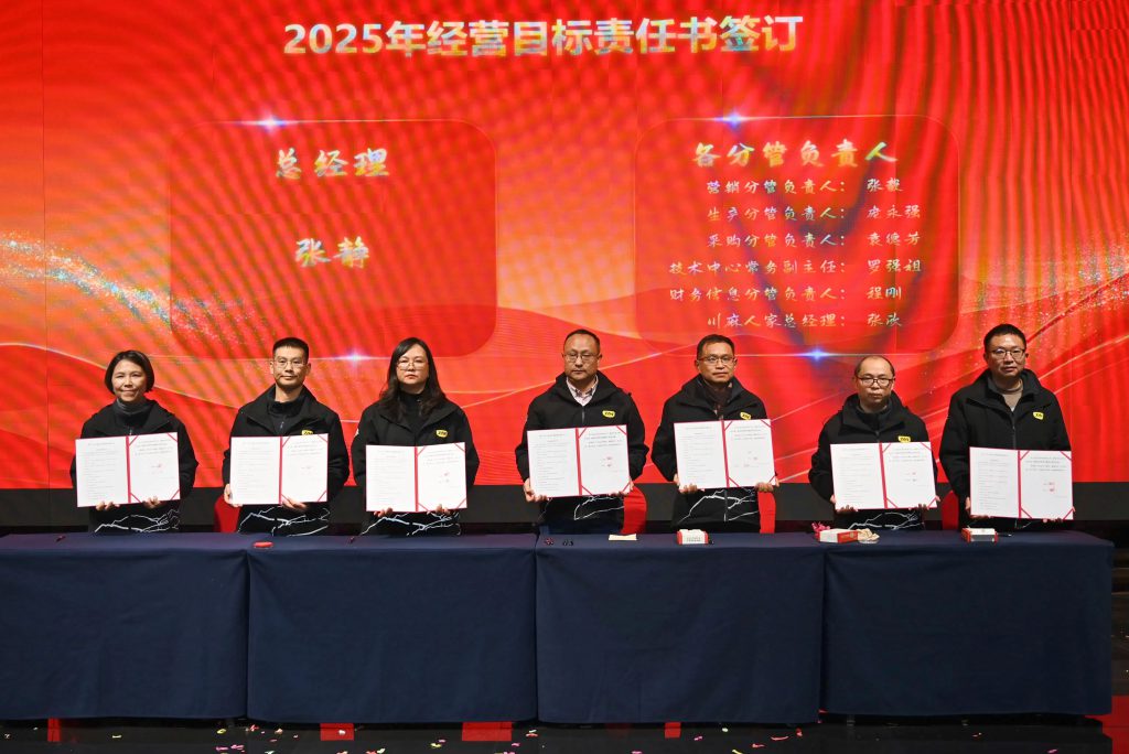 2024年,始終堅持公司利益第一,市場發(fā)展優(yōu)先的市場發(fā)展理念,丁點兒人上下一心,成功實現(xiàn)年度經(jīng)營目標(biāo)。2025年,踏上新的征程,任康董事長、張靜總經(jīng)理與各分管團隊代表簽訂《2025年經(jīng)營目標(biāo)責(zé)任書》。
