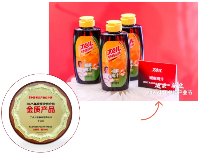 在風(fēng)向標(biāo)產(chǎn)品(春季)全球發(fā)布會(huì)環(huán)節(jié),丁點(diǎn)兒椒麻雞汁隆重亮相,成為全場(chǎng)焦點(diǎn),并以出色味型、獨(dú)特風(fēng)味贏得組委會(huì)和市場(chǎng)認(rèn)可,斬獲“2025年度餐飲供應(yīng)鏈金質(zhì)產(chǎn)品”榮譽(yù)稱(chēng)號(hào)。