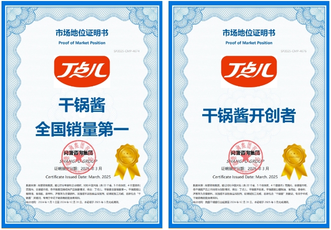 尚普咨詢集團是中國最早成立的專業(yè)市場研究公司之一。其通過行業(yè)專家和企業(yè)調(diào)研,對比中國大陸(含22個省、5個自治區(qū)、4個直轄市)范圍內(nèi),全渠道市場、各干鍋醬產(chǎn)品上市時間與創(chuàng)新情況,從我國干鍋醬行業(yè)起源統(tǒng)計至2024年12月31日,得出丁點兒為“干鍋醬開創(chuàng)者”的認(rèn)證。同時根據(jù)全渠道市場,統(tǒng)計了2024年1月1日至2024年12月31日各干鍋醬品牌相關(guān)產(chǎn)品銷量情況,得出丁點兒“干鍋醬全國銷量第一”的認(rèn)證。