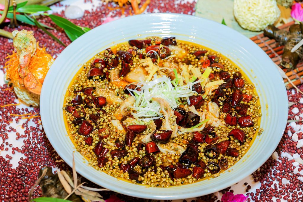 現(xiàn)場,行政總廚李偉、王俊成現(xiàn)場演繹經(jīng)典川菜創(chuàng)新烹飪技法。用丁點兒椒麻雞汁、藤椒油、青花椒麻辣醬等高品質(zhì)特色產(chǎn)品創(chuàng)新打造的紅袍尋雙味、清幽九肚魚等特色風味菜品,將椒麻味型展現(xiàn)得淋漓盡致,香氣溢滿整個會場,引得與會嘉賓紛紛前來品鑒交流。